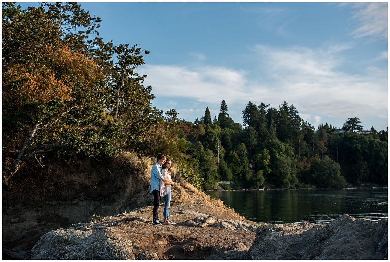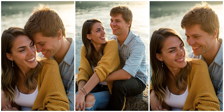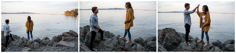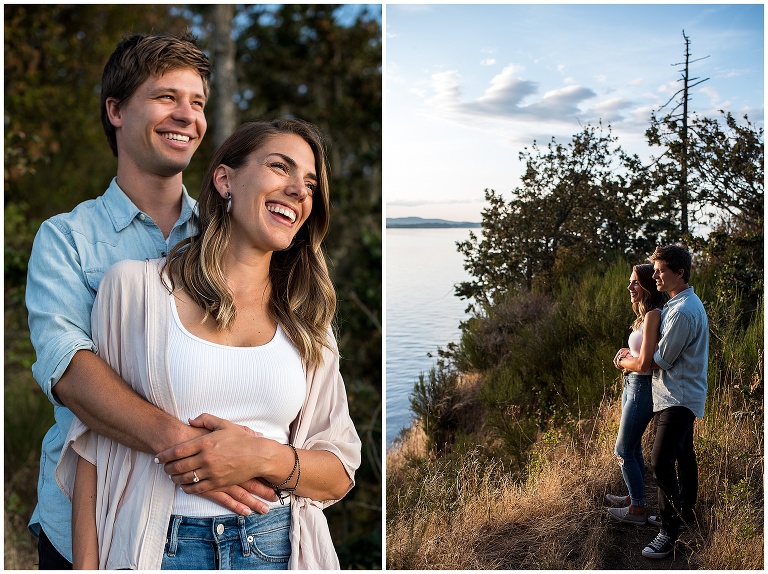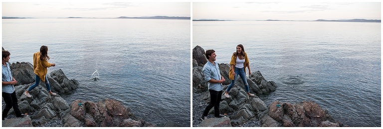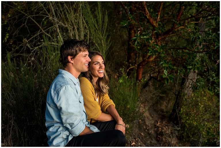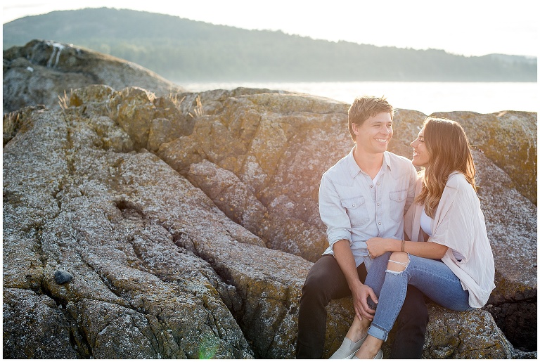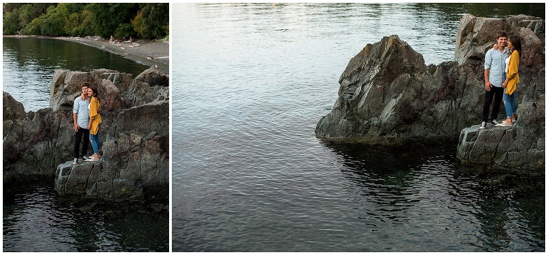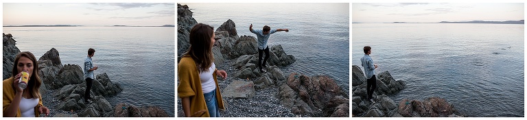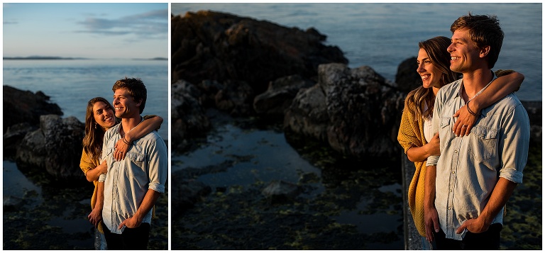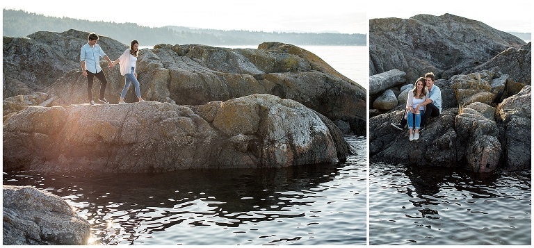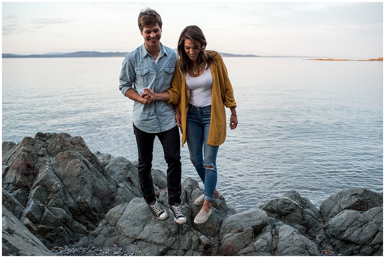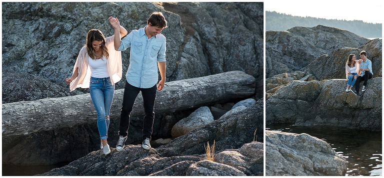 These two had just recently moved back to Victoria after being away for a couple years, and they hadn’t actually been to their beach in a long time. The night before our Victoria BC Engagement Session was scheduled, Andrew decided to ride his bike over to check it out and see if it was as he remembered. A pretty cute texting conversation ensued… between Andrew to Hannah, and then Hannah to me. Hannah was updating me on Andrew’s visit to the beach. She texted: “We always walked to this rocky cliff part that is at the end of the beach… he says it’s soooooo nice! And it’s still in the sun at this time of night!!”